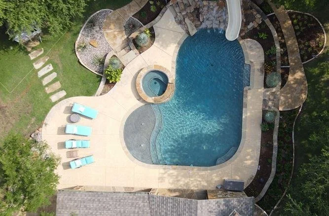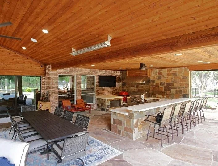 We transformed an existing backyard into a luxurious outdoor oasis, complete with a remodeled inground pool that features new tile, coping, plaster, a hot tub, and a waterfall. Surrounding the pool, newly added landscaping and walkways echo the natural curves of the terrain. The project's centerpiece is a covered living area, designed with 3D software, that includes a living/dining/outdoor kitchen space with a large natural stone outdoor fireplace and motorized screens, providing a year-round gathering spot. The completion of this comprehensive outdoor living space ensures an unmatched experience for entertaining family and friends.