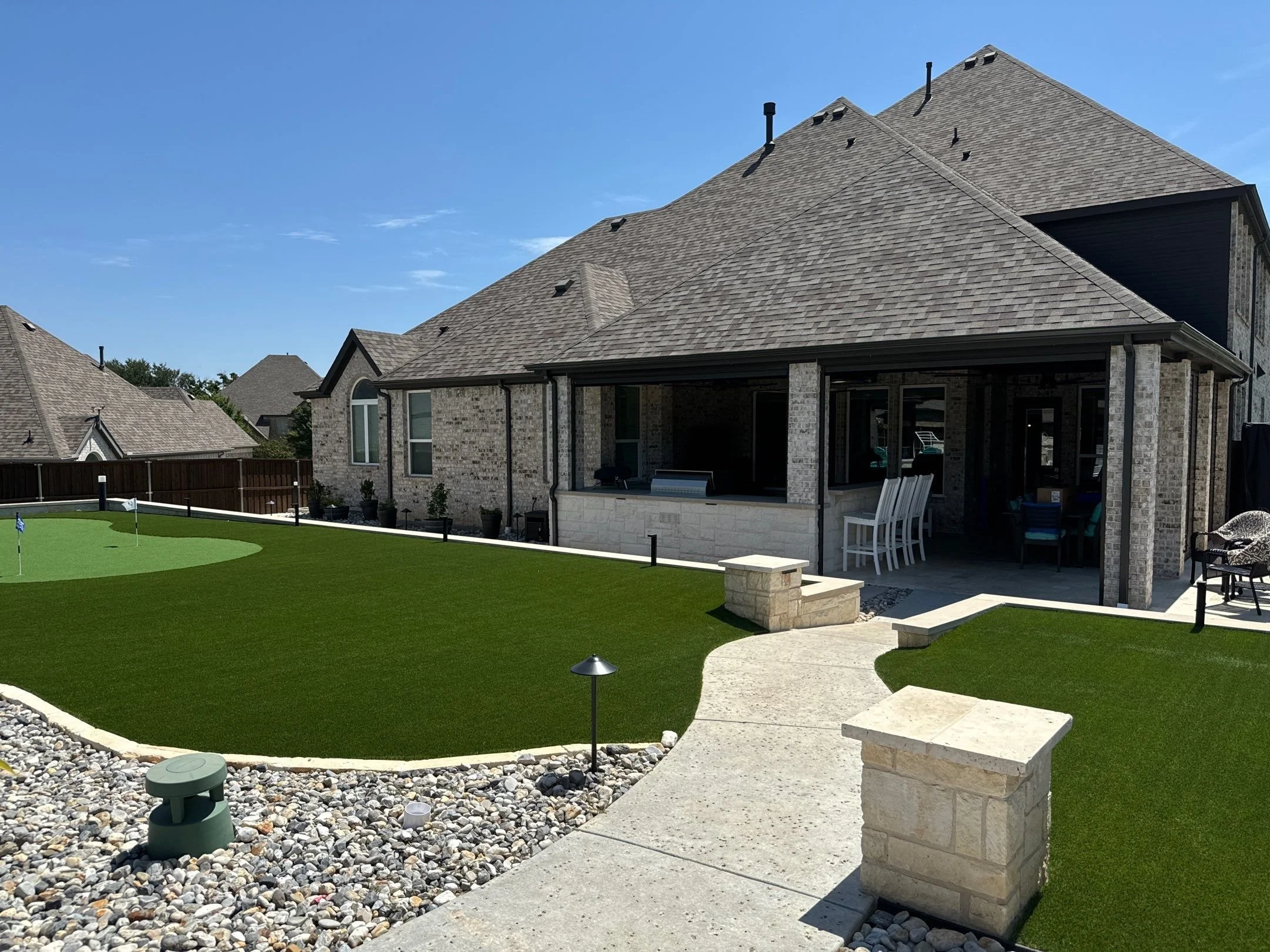 A putting green in Weatherford, TX built with synthetic turf delivers superior performance and minimal maintenance. Artificial turf retains color, texture, and play quality through every season, eliminating the need for watering or mowing. With professional installation, your green will have proper grading, drainage, and a stable base for consistent play. It’s also environmentally friendly—reducing resource use while providing a luxurious outdoor experience. Designed to handle Texas weather, it stays smooth and vibrant for years. With expert craftsmanship and precision installation, Hillman Outdoor Living builds putting greens that look beautiful, perform flawlessly, and stand up to everyday use.